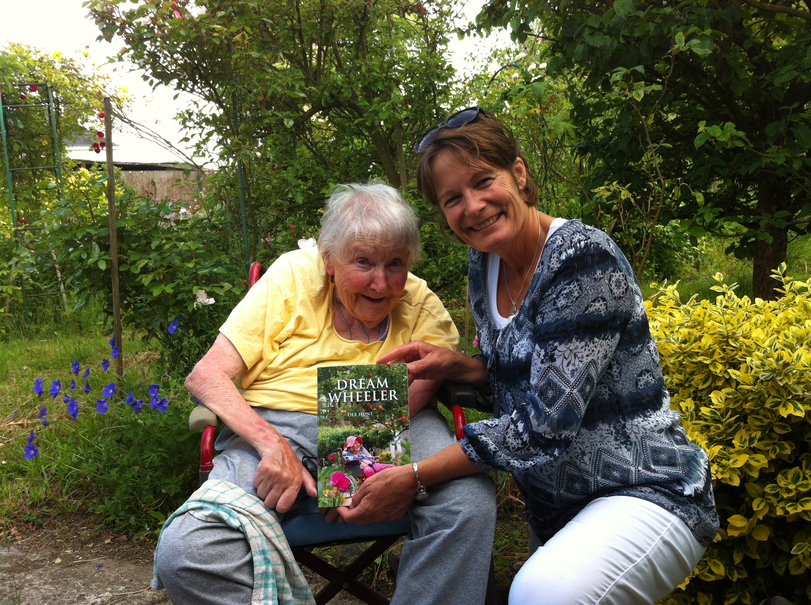 Me and Jane in her back garden in France, with the first printed copy of her book