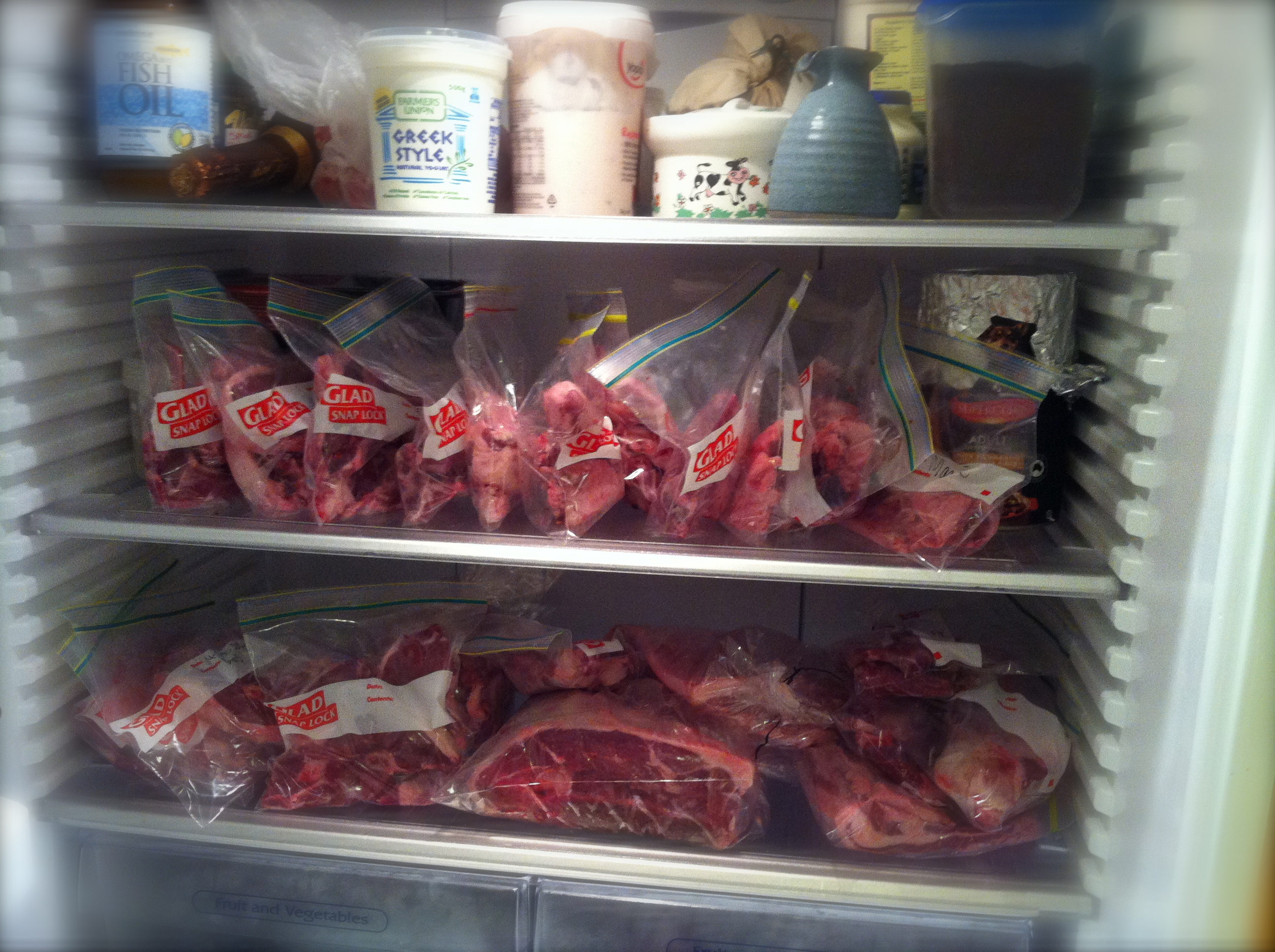 Identifying the leg was easy but it’s been so long since I handled meat everything else just looked like…well, like meat. I filled the freezer bags with whatever would fit, occasionally writing Maggie’s name on a bag with a totally unidentifiable chunk of something that looked like it belonged in a dog’s bowl and not on a dinner plate.  After an hour of gruesome work I had two shelves of neatly stacked bags.