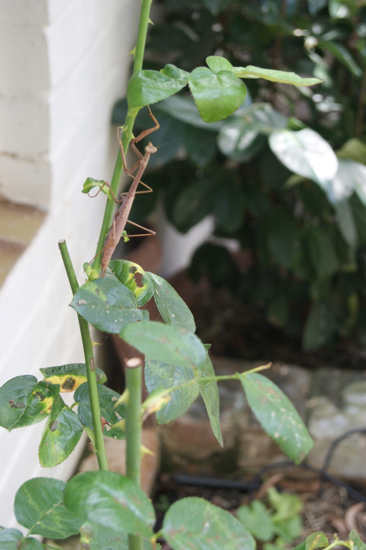 Plucking the preying mantis off the Peace Rose and dunking him in a bucket of water seemed to do the trick: he survived. Not for long though. The female I spotted must have eaten him. Hope he had some fun first.