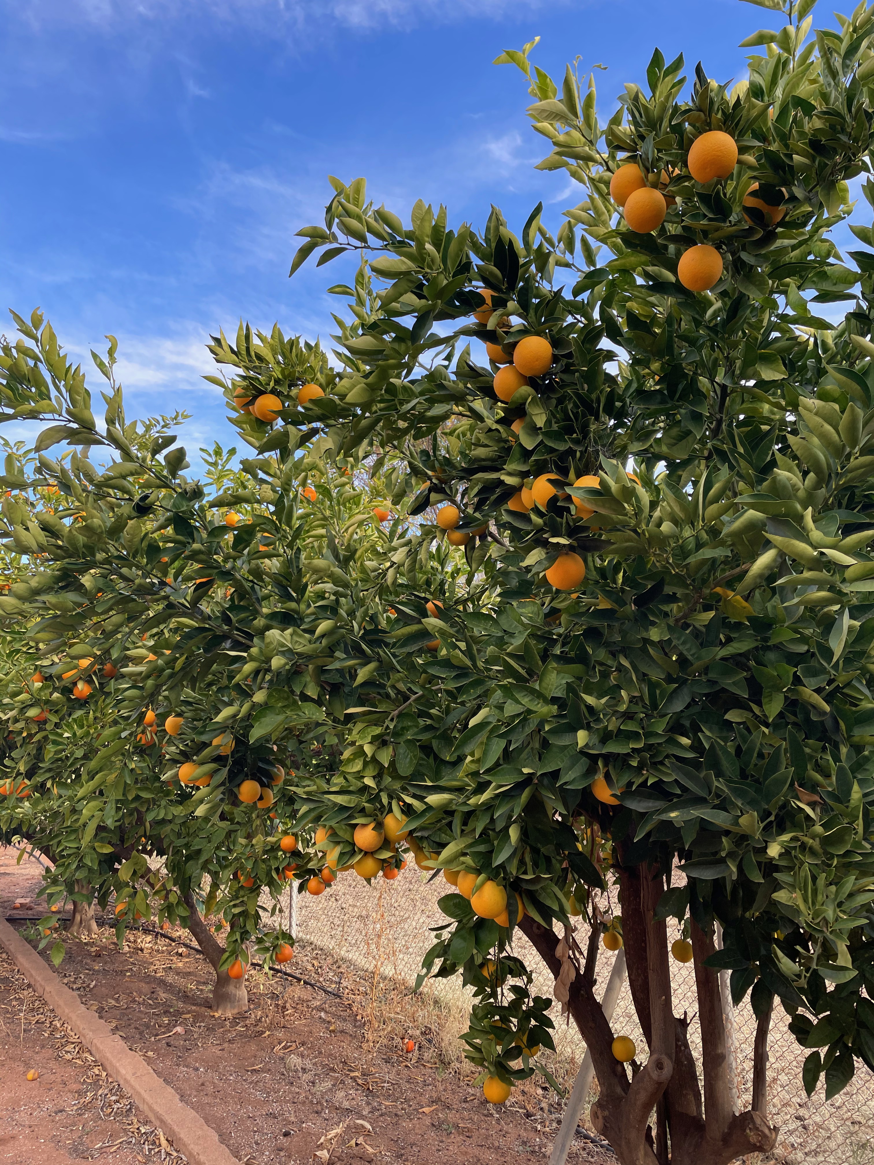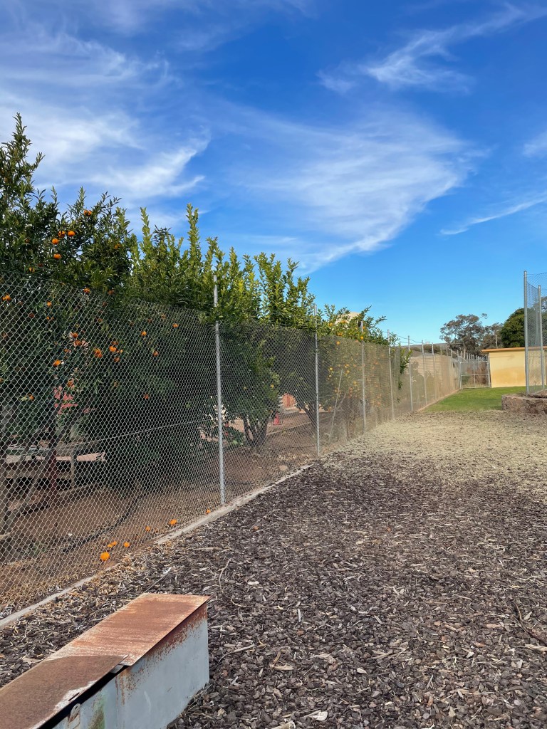 One day, not so long ago, I walked to the supermarket and stopped on the way to admire the farm, as usual. On the way back, weighed down by a backpack full of groceries, bag in each hand, I was walking slowly enough to notice a line of citrus trees planted down the side of the factory.