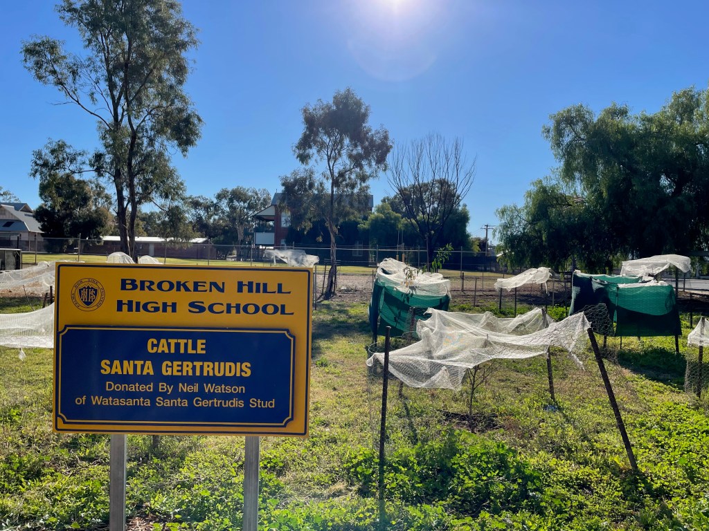 My attention is always drawn to the school on the opposite side of the road, where their thriving miniature farm has an orchard, sheep, grapevines and a crop of green lucerne. Gertrude is often there, grazing placidly in the background. I don’t know if her name is Gertrude, but the sign suggests it should be.